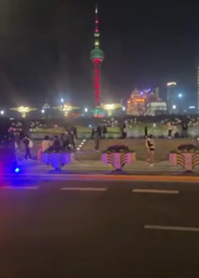 n urban scene at night, with the Oriental Pearl Tower prominently lit in the background. There are several buildings with illuminated windows visible, along with decorative lights in the foreground. People are walking and standing on what appears to be a tiered public space. There are planter boxes with flowers or decorations along the edges of the steps. The foreground is an asphalt road with white lane markings. Blue lights appear to be emanating from the left side of the frame.