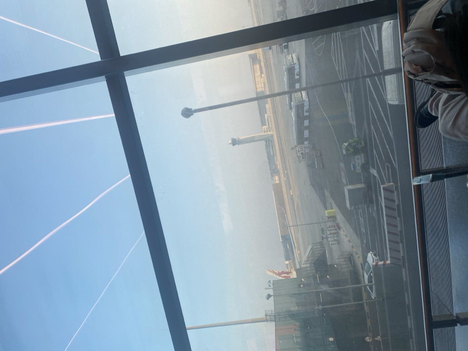 An airport scene viewed through a window. An air traffic control tower stands in the distance. A road runs parallel to the terminal. Vehicles and machinery are visible on the ground. A portion of the window frame is in the foreground, and vapor trails can be seen in the blue sky. A person is seated next to the window. The image is somewhat hazy due to the sunlight and the window.