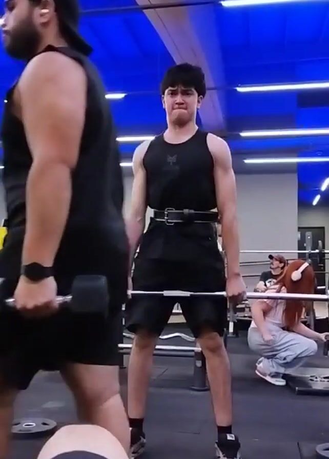 The video captures a moment at a gym, focusing on a young man preparing to lift a barbell