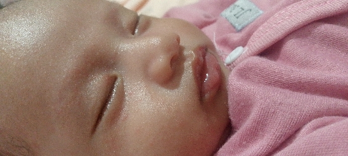 A sleeping baby, seen in close-up profile, rests against a pink fabric. The baby's skin appears dewy, eyes are closed, and the mouth is slightly open. The pink garment, possibly a onesie, features a white button and a tag with the letter "J" visible. The fabric has a textured, knit-like appearance. The overall image conveys a sense of tranquility and innocence.