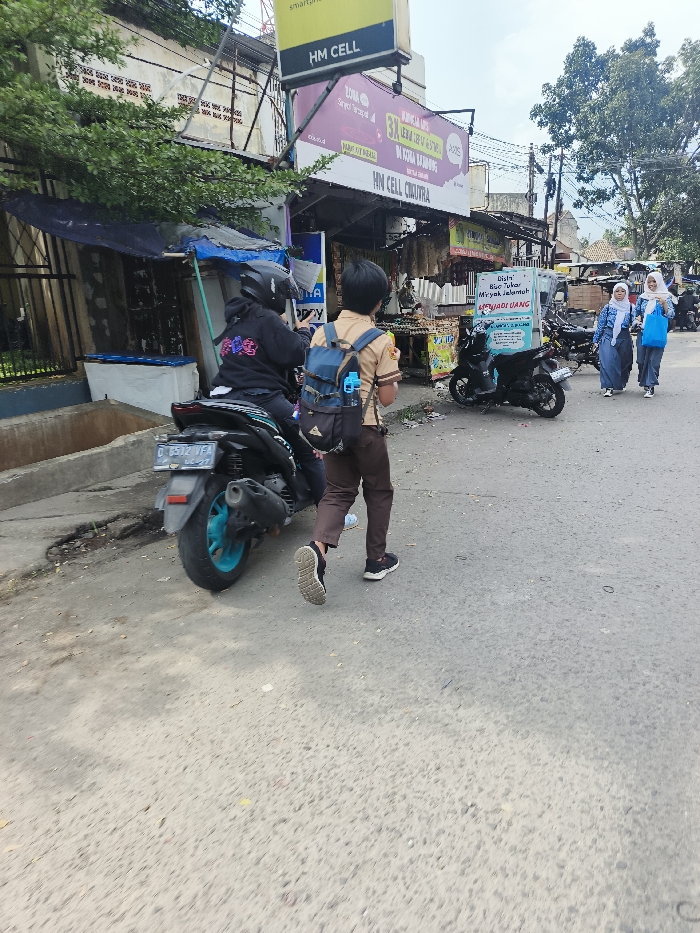 An outdoor scene in Bandung City, Indonesia, specifically near the Cikutra area, shows a street lined with commercial establishments. In the foreground, a young male student wearing a brown uniform and dark trousers, with a dark blue backpack and a light blue water bottle, walks away from the viewer towards the right. To his left, a person wearing a black hoodie and helmet is stationary on a black scooter (license plate D 6512 VEA, featuring a teal rear rim). In the mid-ground, a black motorcycle is parked near a blue and white banner advertising "Bisnis Blue Tukar Minyak Jelantah Menjadi Uang." Further down the street on the right, two females, both wearing hijabs (one light blue, one white) and modest clothing, walk towards the foreground. Overhead, a yellow sign displays "HM CELL," and below it, a larger sign features "HN CELL CIKUTRA" and advertises "ZONA Sinyal Super Cepat" with "3X Lebih Luas di Kota Bandung." The street surface is asphalt with minor cracks. On the left, green foliage partially obscures a fence and a structure covered by a blue tarp. Utility poles and overhead wiring are visible in the background, against a diffused daylight sky.