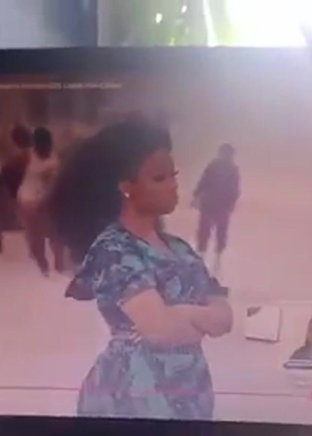TV screen displaying a scene from a Nigerian movie titled "WEDDING | Nigerian Movies 2025 Latest Full Movies." The scene appears to be filmed on a beach. A woman with dark, curly hair is standing with her arms crossed, facing right. She is wearing a floral patterned dress. In the blurred background, several other figures can be seen. There is a plant slightly visible in the upper right corner of the frame. A small window with a video thumbnail is visible in the bottom right corner of the screen. The video is shot from an off-center angle.