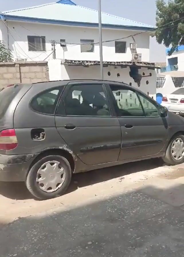 street scene on a sunny day. Two cars, a dark gray minivan and a black sedan, are parked on the side of a rough, paved street. A white two-story building with a blue-trimmed roof is in the background. The building's exterior is painted white with some decorative elements. A street light pole stands near the building. A man wearing a brown shirt and blue pants rides a blue motorcycle down the street. The motorcycle passes the parked cars. There are some bricks and a pile of gravel near the building.