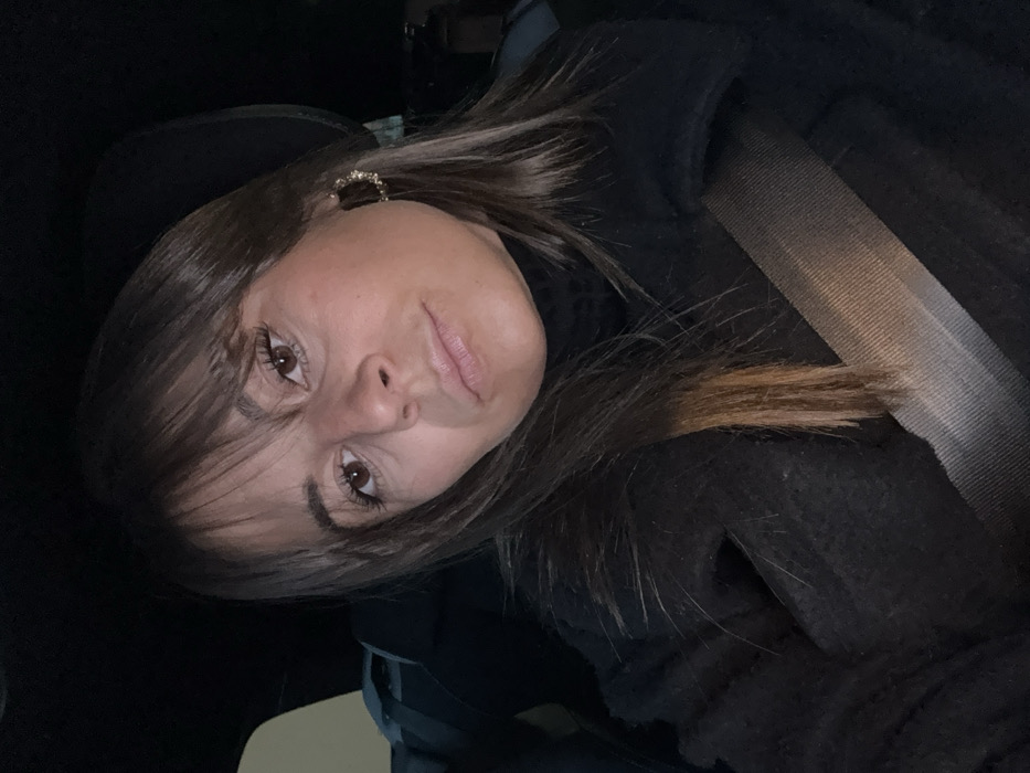 The image presents a medium close-up portrait of an adult female situated within the dark interior of a vehicle