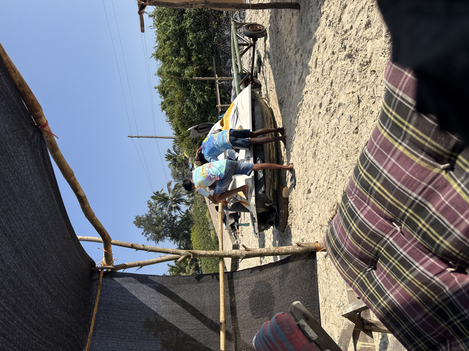 Two men in t-shirts and shorts stand beside a small boat on a trailer. The boat and trailer rest on sandy ground. Overhead, a structure of bamboo and black netting provides shade. A person's body and plaid cushion are in the foreground, partially obstructing the view. Trees are visible in the background, and the sky is clear.