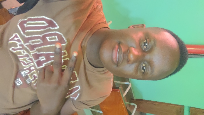 A person with short dark hair and dark eyes is looking at the camera and smiling. They are wearing a brown t-shirt with white and red letters and are holding up two fingers, with the fingernails painted orange. The background is a light green wall with some wood furniture in the lower portion of the frame. The image has been rotated so that it is on its side.