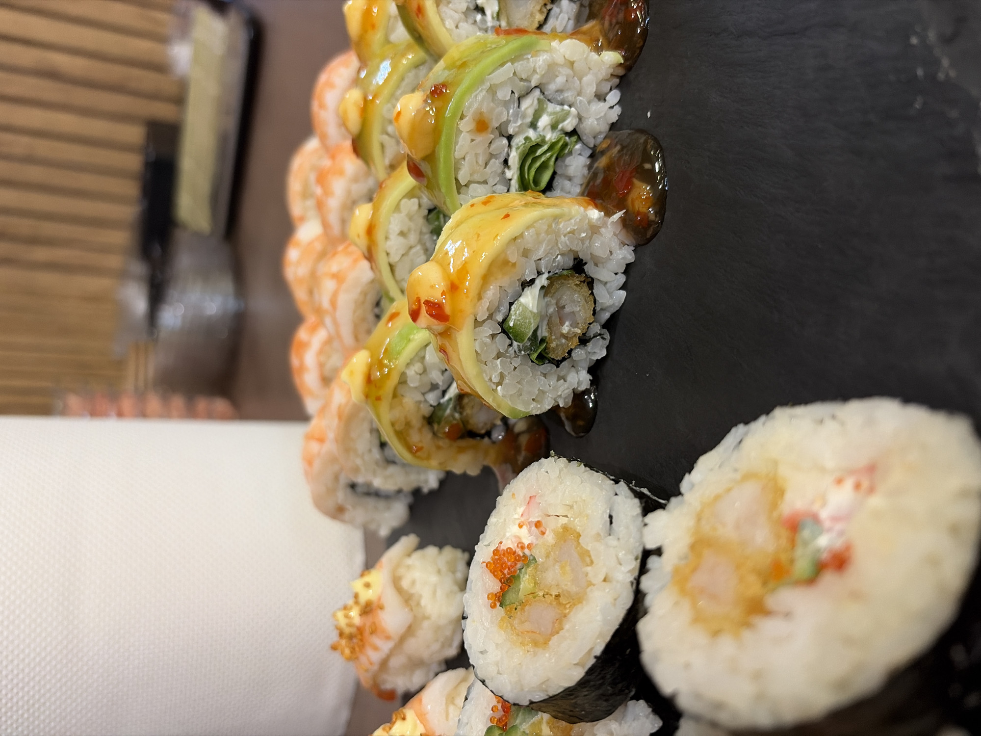 The scene is an indoor, well-lit setting in Pleven, Bulgaria, depicting an array of sushi items arranged on a dark, textured serving surface. In the foreground and mid-ground, various sushi rolls are presented. To the left, several nigiri-style pieces are visible, each topped with a cooked shrimp, a dollop of white sauce, and small, golden-brown crunchy garnish. Adjacent to these are several cut maki rolls, one prominently featuring a cross-section of white rice, partially wrapped in nori, enclosing a fried tempura shrimp, cucumber, cream cheese, and imitation crab, topped with bright orange tobiko. A similar, blurry roll is in the immediate foreground. To the right, a row of approximately ten uramaki (inside-out) rolls are arranged. These rolls consist of white rice on the exterior, are capped with thin slices of green avocado, and heavily drizzled with a glossy orange-red sweet chili sauce that has pooled onto the black serving surface. Their cross-sections reveal fillings of tempura shrimp, green lettuce, and white cream cheese. In the mid-background, another row of uramaki rolls with shrimp toppings and a light sauce is partially visible. The food rests on a matte, dark grey or black textured surface, likely a slate or stone serving board. The background is out of focus, featuring a large roll of white paper towels vertically positioned on the left. Behind the sushi, a blurred wooden slatted wall in a light brown tone is visible, along with indistinct clear plastic containers and dark trays, suggesting a commercial kitchen or food preparation area.