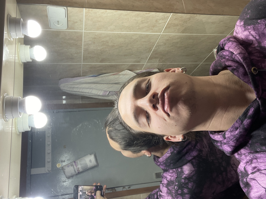 A selfie in a mirror shows a young man wearing a purple tie-dye hoodie. He has dark hair and wears earrings. The mirror reflects the bathroom setting, including light fixtures, tiled walls, and a white towel hanging. The reflection of the man is visible, as is the phone he uses to take the picture.