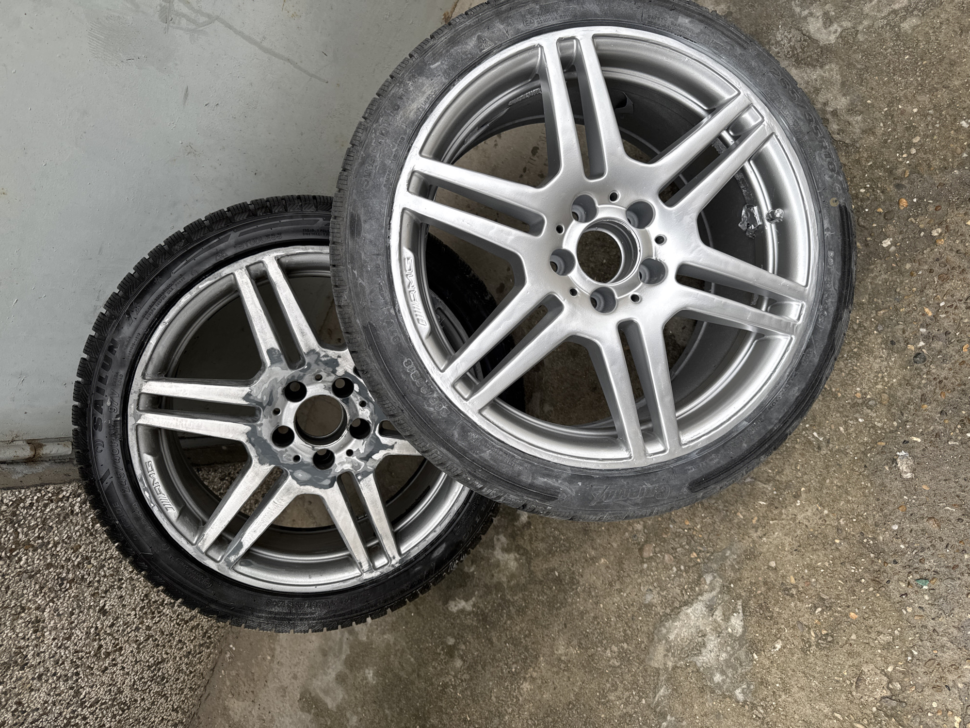 Two silver alloy wheels with tires are lying on a textured concrete surface. The wheel on the right is slightly larger and positioned at an angle, partially overlapping the smaller wheel on the left. The tires appear used and have some dirt on them. The wheel on the left has noticeable scratches or imperfections on its surface. One tire says "SAILUN STUDLESS". The location is inferred to be Silistra, Bulgaria, based on the request. The background includes a gray, possibly cement wall.