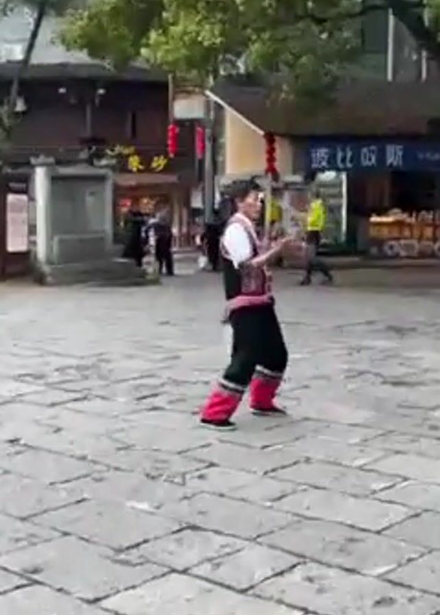 A man wearing a traditional pink and purple vest and pants performs a juggling routine with two machete-like objects on a gray brick plaza. The man is the sole focus of the video. A traditional Chinese building with red lanterns is in the background. Trees are also in the background. Other people walk in the background.
