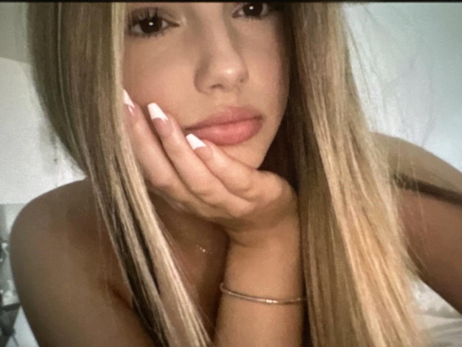 The image displays a female individual in a close-up portrait, oriented in a clockwise rotation. Her head is angled, with her right eye, nose, and pink-toned lips visible. Her left hand, adorned with white French-tipped fingernails, rests against her lower cheek and jawline. Long, straight blonde hair cascades across the frame, partially covering her left shoulder and extending into the foreground. A thin, silver-toned bracelet is present on her left wrist. The upper left quadrant of the image shows a bare, tanned shoulder or upper arm. The background is indistinct and uniformly light-colored, indicative of an indoor setting with soft focus. No specific features within the image provide information regarding a precise location in the city of Lukovit, Bulgaria.