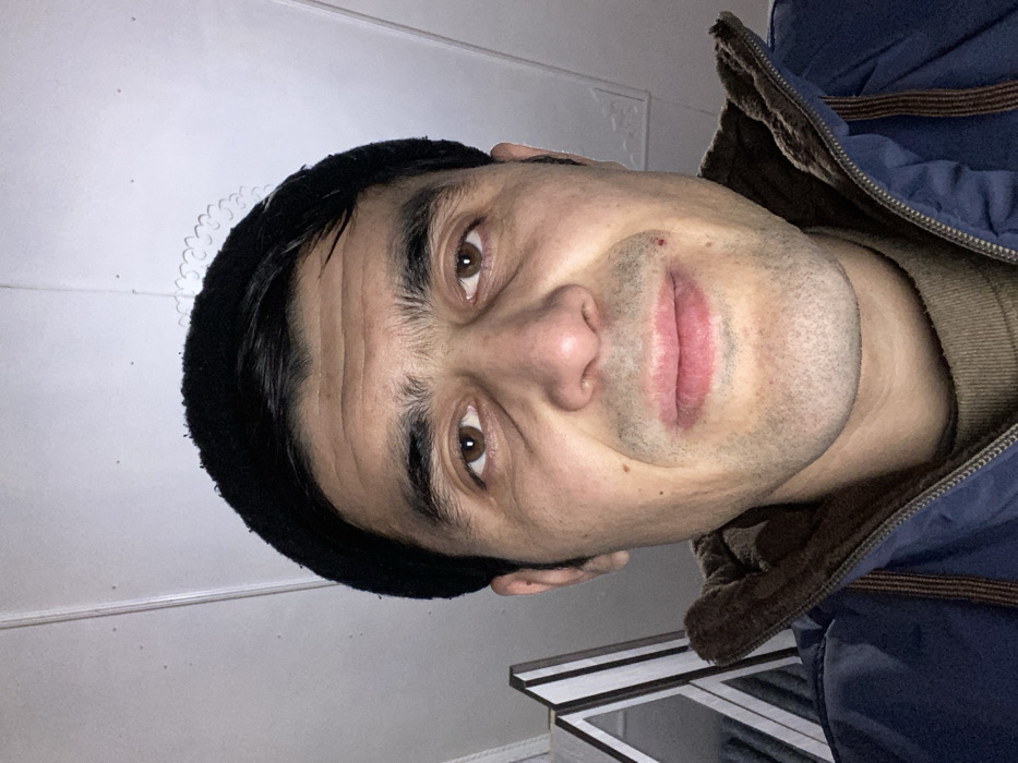 A man faces the camera wearing a dark beanie and a blue jacket with a brown collar. His eyes are brown. He has short dark hair visible under the beanie. The lighting is dim. A white ceiling and a glimpse of furniture are visible in the background. The photo has been rotated.