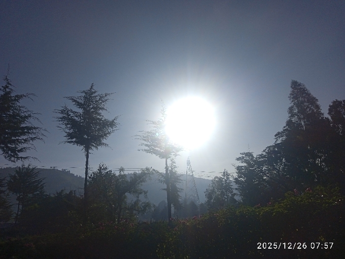 A sun-drenched landscape is filled with trees of varying heights and foliage density, their silhouettes stark against the bright sunlight. Hills or a sloping terrain rise subtly in the background, almost obscured by a misty atmosphere. A lattice-like tower structure is visible amidst the trees, adding a hint of human construction to the scene. The photograph has a timestamp indicating "2025/12/26 07:57" suggesting the time of capture.