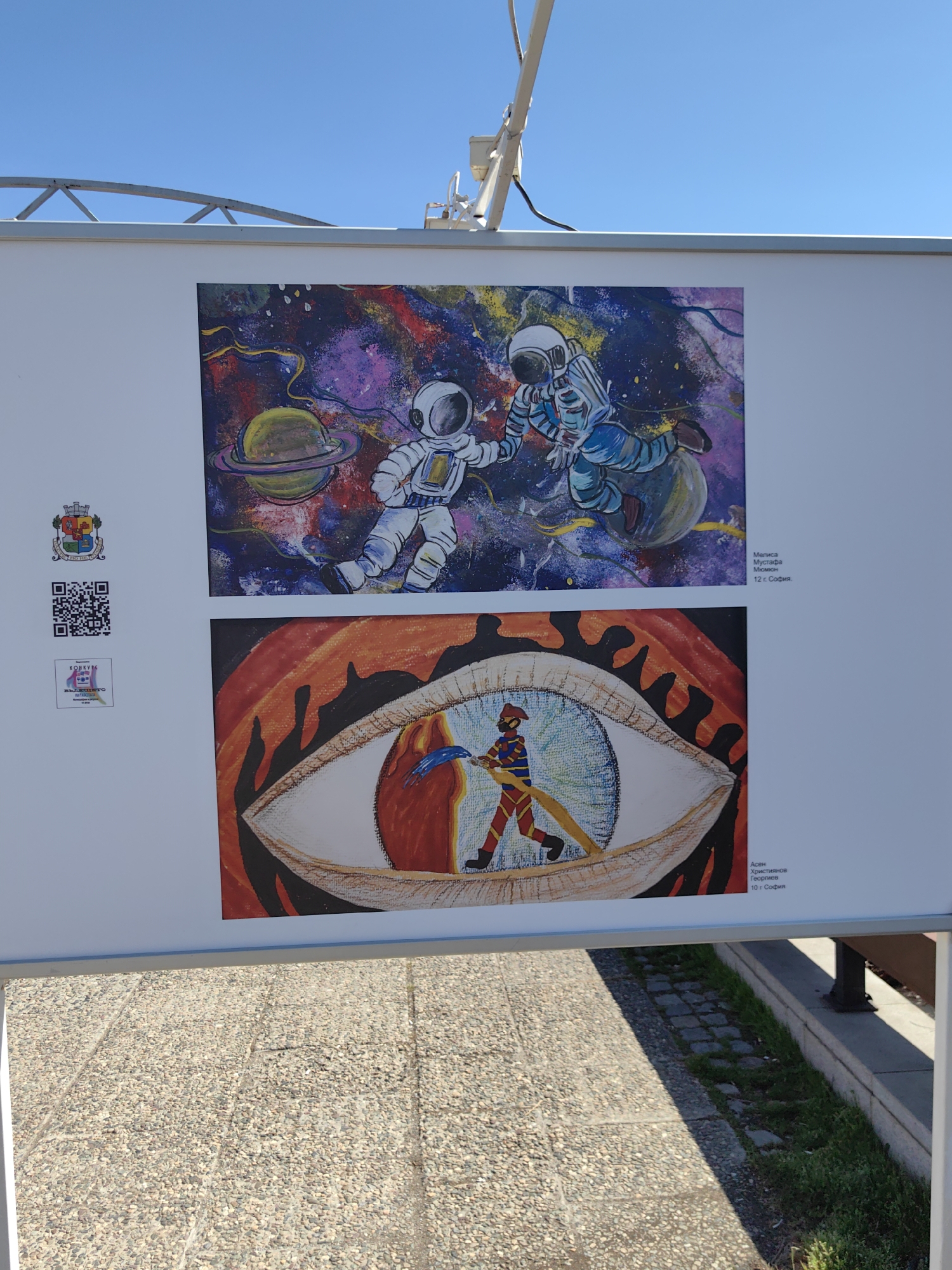 white signboard with two children's drawings displayed on it. The top drawing depicts two astronauts in space against a colorful backdrop of planets and stars. The bottom drawing features a large eye with a figure inside, the figure is holding a rope. Text is visible near each drawing, likely the artist's name and age. The signboard is mounted on a metal frame and appears to be outdoors. The ground visible is a paved area with some grass and vegetation nearby. Based on the writing in Bulgarian and the mention of Sofia, it can be inferred that the location is likely Sofia, Bulgaria.