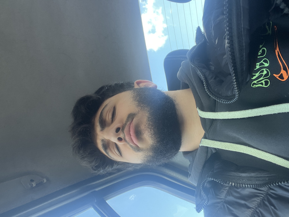 A male individual is depicted in a close-up, chest-up view, seated inside what appears to be a vehicle in the city of Al-Kiswa, Syria. He has dark, wavy hair, a dark full beard, and a mustache. His eyes are closed, and his head is tilted slightly upwards. He is wearing a black hooded sweatshirt with light green drawstrings, over which a black puffer jacket is worn, partially unzipped. A partial orange Nike swoosh logo and green abstract graphics are visible on the front of the sweatshirt. The vehicle's light-colored ceiling liner is visible at the top of the frame. Through the vehicle's windows, a clear blue sky with some scattered white clouds is visible, indicating daytime. The individual appears to be resting or sleeping.