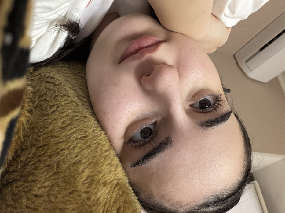 A close-up, diagonal portrait displays a single female individual lying down indoors