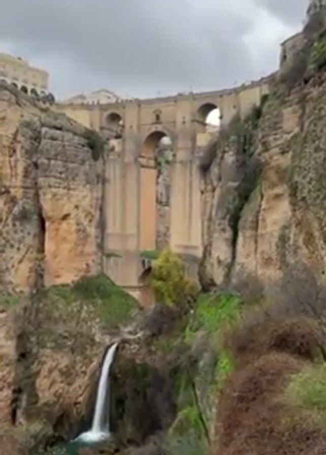 view of the Puente Nuevo bridge in Ronda, Spain. The bridge spans a deep gorge, and a waterfall flows into the pool at the bottom. The cliffs of the gorge are covered in greenery. The sky is overcast.