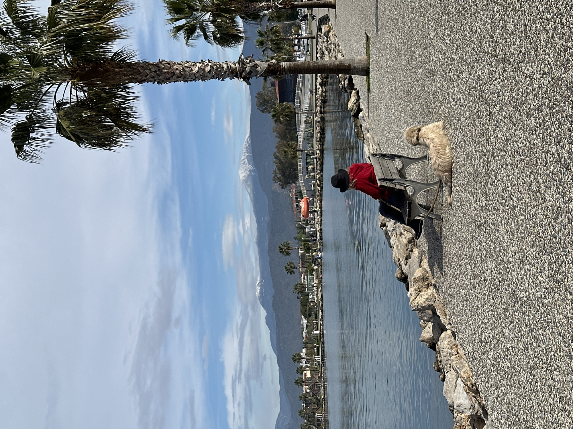 A single individual and a dog are observed on a waterfront promenade in Fethiye, Turkey. The scene depicts a sunny day with a partly cloudy blue sky. The individual, seen from behind, is seated on a dark-colored public bench. They wear a black wide-brimmed hat, a red long-sleeved garment, and dark trousers. Their posture indicates they are facing the body of water and the distant landscape. Adjacent to the bench, a light-colored, shaggy-furred dog, possibly a Golden Doodle, is lying prone on the aggregate-surfaced promenade pavement, also facing the water. A leash is visible, extending from the dog and resting on the pavement near the bench. The body of water, likely a bay, is calm with minor ripples. The promenade edge consists of stacked rocks forming a barrier with the water. Along the promenade, multiple tall palm trees are present, one prominently in the mid-ground on the right side of the frame. Across the water, a developed shoreline is visible, featuring various buildings, additional palm trees, and a white bridge structure. An orange, boat-like object is discernable near the far shore. In the background, a range of dark, rugged mountains rises, with several peaks exhibiting patches of snow.