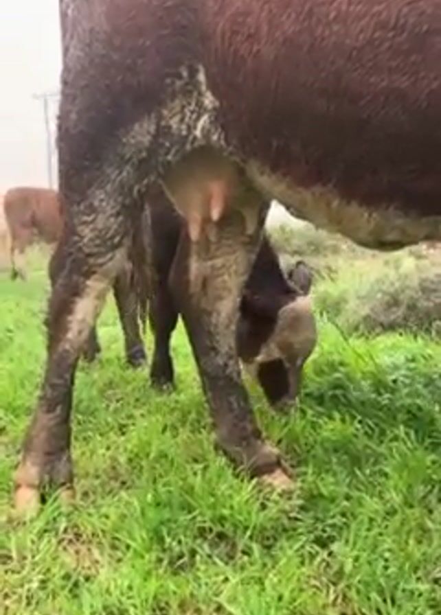 A close-up, shaky video shows a cow grazing in a grassy field. The cow is a dark brown and white color and is covered in mud. There is a calf standing behind the cow, also grazing. In the background, there is another cow and some hay. The grass is green and wet, and the sky is overcast. The camera moves slightly as the cow moves.