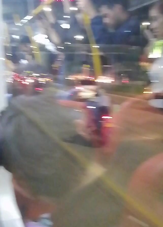 The video appears to be shot from inside a moving bus at night
