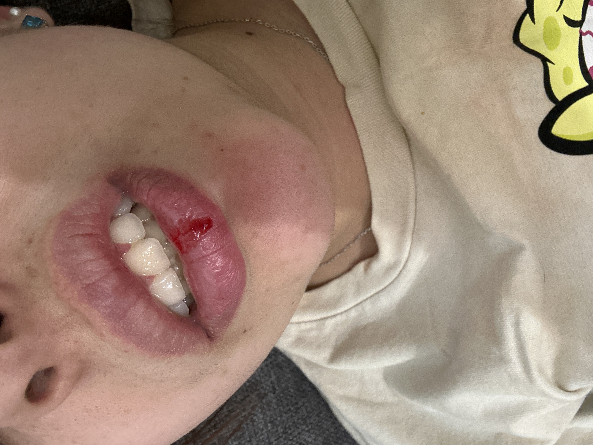 A close-up, high-angle view captures the lower half of a human face, focusing on the mouth. The subject, appearing to be an individual with light skin, has slightly parted lips, revealing several white, intact upper and lower front teeth. A laceration is visible on the central-right portion of the lower lip, from which a distinct drop of bright red blood is actively present. The area immediately surrounding the wound appears slightly swollen and reddened. To the right of the subject's face, an earlobe is visible, adorned with a blue rectangular stud earring. A thin, silver-colored chain necklace rests around the neck. The individual is wearing a light-colored (beige or off-white) t-shirt, a portion of which displays a cartoon graphic featuring a yellow element with a dark outline and what appears to be a part of an eye with red veins. The background on the left side consists of a dark, textured fabric, possibly upholstery. No discernible features within the image provide information to determine a specific geographic location, including the city of Sofia, Bulgaria.
