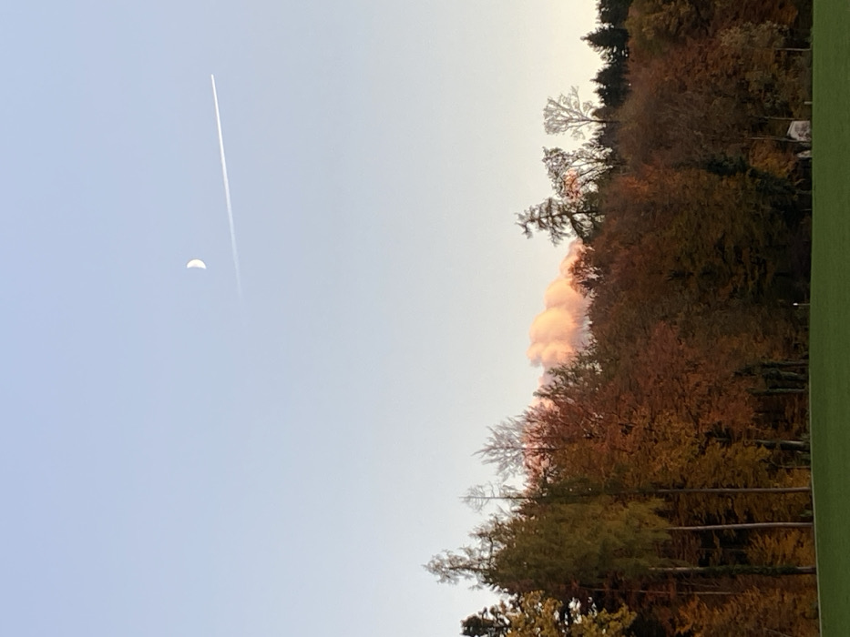 The image displays an outdoor scene in Glattbrugg, Switzerland. The upper two-thirds of the frame features a clear, light blue sky. A slender, right-facing crescent moon is visible in the upper center, and a single white aircraft contrail extends horizontally across the sky, passing beneath the moon. The midground is occupied by a dense band of trees exhibiting autumnal foliage, with canopies displaying varying shades of green, orange, red, and brown. Behind these trees, slightly to the left of center, a large, diffuse formation, consistent with a cloud or a plume, is prominently visible, illuminated with a distinct pink and orange coloration, indicative of a low sun angle. The lower third of the image consists of a uniform, manicured green grass area. No individuals, specific structures beyond the natural environment, or discernible actions are present within the scene.