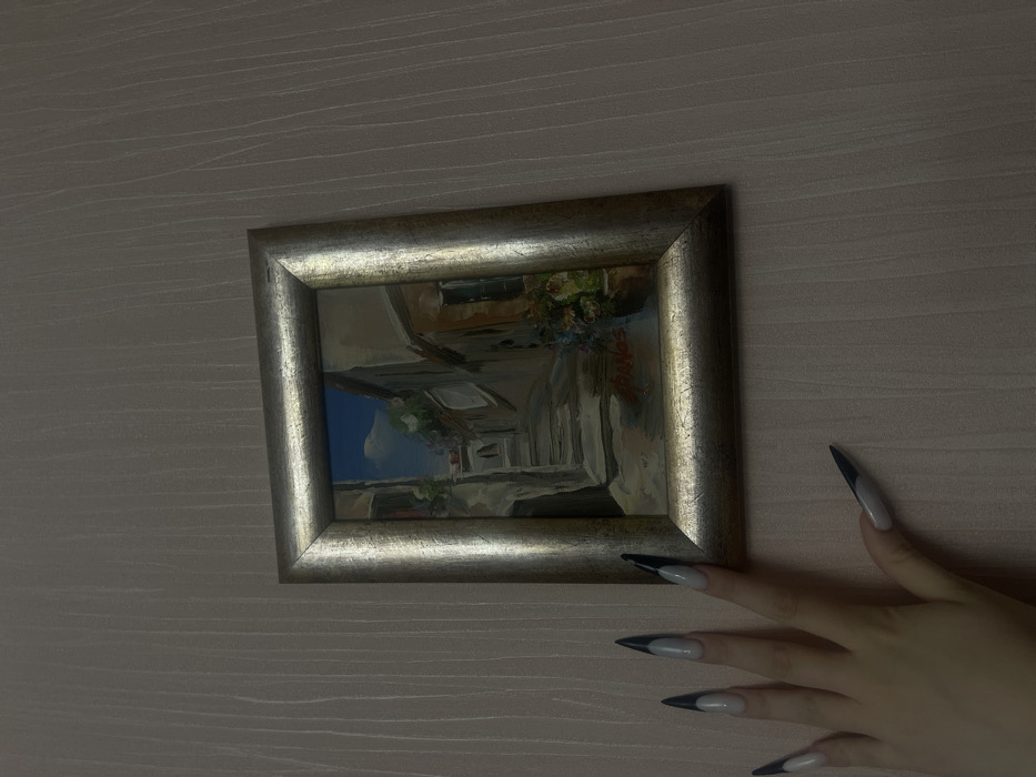 A framed landscape painting hangs on a textured beige wall. The painting depicts a building exterior with blue sky visible between structures and flowers hanging from ledges. A hand with long, pointed nails, painted with a light base and dark tips, extends towards the painting. The fingers are positioned to point at the lower-right corner of the frame, casting a shadow.