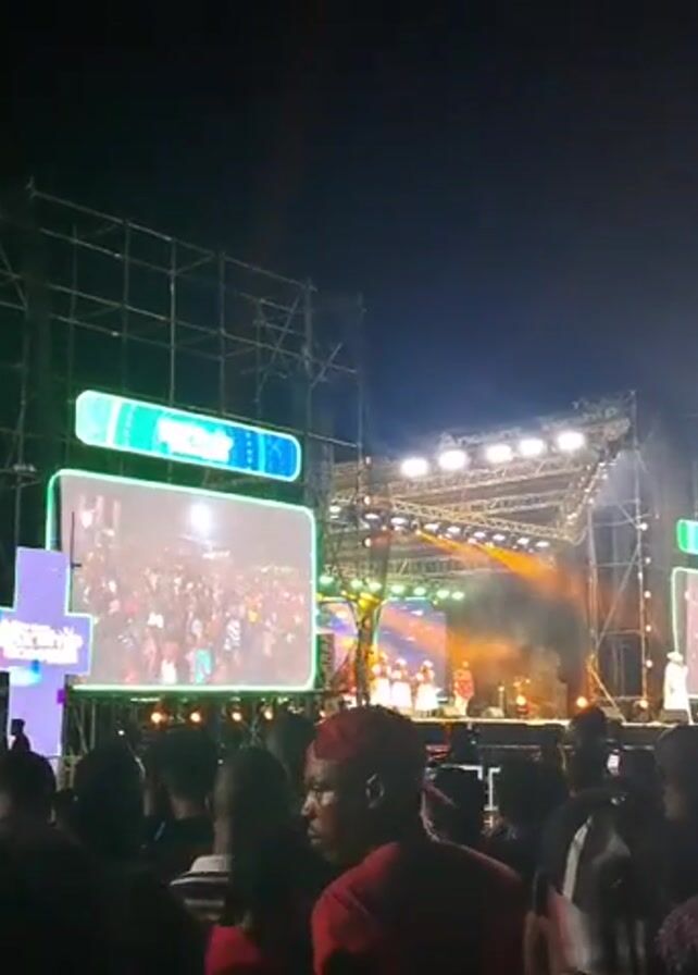 large crowd of people attending an outdoor event at night. A stage is set up with screens displaying images of the crowd. Performers are on the stage. A large metal scaffolding structure supports the screens and stage. The lighting is bright with stage lights illuminating the performers. Many members of the crowd are looking towards the stage.