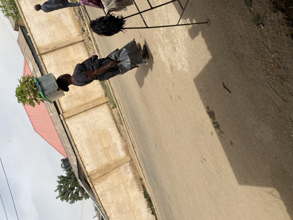 The image depicts an outdoor street scene in Jos, Nigeria, under daylight conditions. The central subject is an adult woman, mid-stride, walking from left to right along the edge of a light-brown paved road. She wears a dark, patterned short-sleeved dress and open-toed footwear. Balanced on her head is a rectangular, light-grey plastic container with a green rim, holding a small green-leafed plant. In her left hand, she carries a crumpled black plastic bag. Behind the woman, a tall, light-brown textured wall runs parallel to the road, topped with corrugated metal sheeting. Beyond the wall, a building with a prominent red corrugated metal roof is visible. To the far left, a dark water tank sits on a roof, near a large green tree. A partially visible male figure in dark attire walks further down the road, to the right of the woman. In the immediate foreground, to the right, a black metal stand supports a dark wig or hairpiece, with some fabric draped nearby. Shadows are cast onto the road from this stand and an unseen structure to the right. The road surface exhibits some darker stains and a small, reddish-brown worm-like object. The sky is bright and hazy.