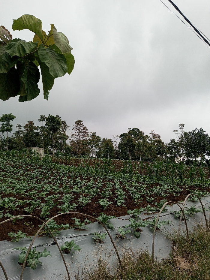 An outdoor forensic image depicts an agricultural field in Kondha, India, under an overcast, light gray sky. In the foreground, a large green leafy branch partially obstructs the top-left corner, and multiple dark power lines traverse diagonally from the top-right. The mid-ground reveals rows of cultivated plants: the nearest rows feature small green leafy plants, possibly a brassica variety, growing through a light-colored plastic mulch with several arched support structures. Further into the field, taller, slender green plants, consistent with corn or maize, are arranged in rows amidst dark brown soil. The background is dominated by a dense line of various deciduous and evergreen trees of differing heights. A light-colored structure, possibly a water tank or utility building, is partially visible among the trees on the left side of the background. No individuals are visible.