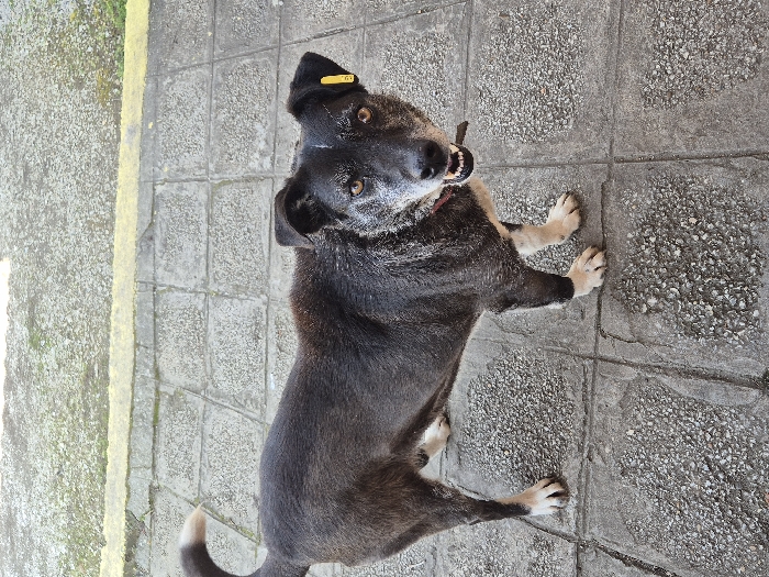 - "A medium-sized dog, predominantly black with white and gray fur on its muzzle, chest, and paws, stands on a tiled concrete surface in the city of Pavlikeni, Bulgaria" by FM-WH1aF2, licensed under CC BY 4.0