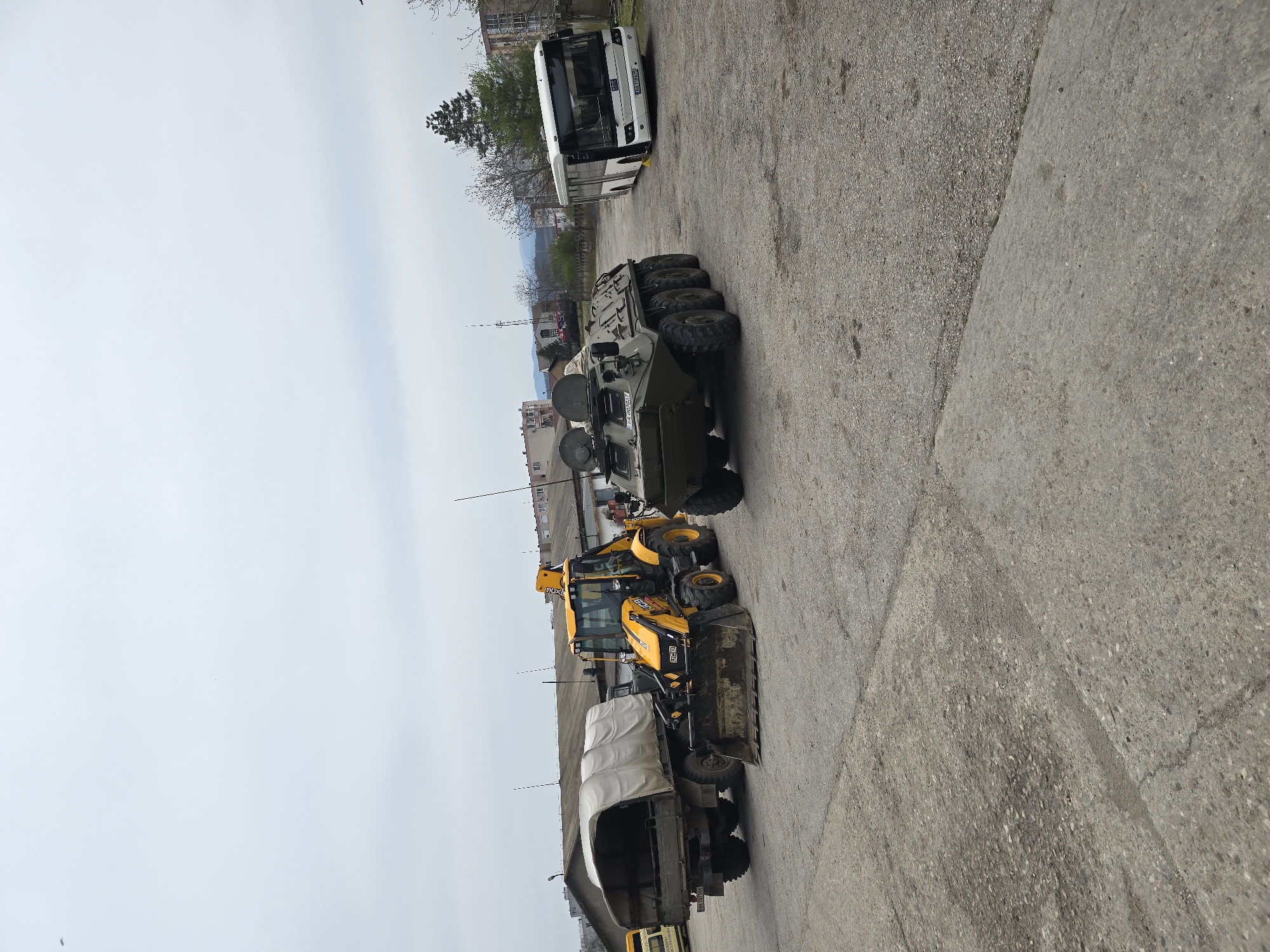 street scene in Veliko Tarnovo, Bulgaria. A military armored vehicle and several civilian vehicles, including a bus, a truck covered with a white tarp, and a yellow backhoe loader, are parked on a concrete surface. Buildings can be seen in the background. The sky is overcast.
