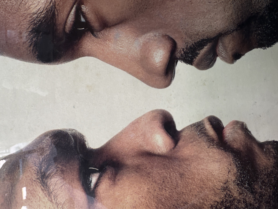 This image presents a close-up, side-by-side profile view of two adult males, described as being located in Pecatu, Indonesia. The subject on the left exhibits dark skin, a prominent eyebrow, an eye directed towards the right, a substantial nose, and short facial hair consisting of a mustache and beard stubble on the chin and jawline. The subject on the right, also with dark skin, displays a prominent eyebrow, an eye directed towards the left, a substantial nose, and a trimmed mustache with a goatee-style beard. Both profiles are oriented towards each other with minimal space between them, suggesting a direct gaze or confrontation. The background is an undifferentiated light-toned surface. Reflections, consistent with a framed picture under glass or a glossy print, are visible as bright streaks on the upper surface of the image.