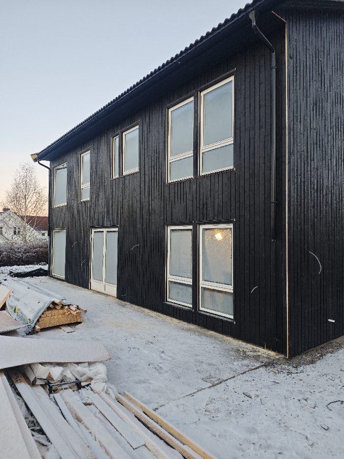 The image displays the exterior of a two-story building in Ottestad, Norway, under winter conditions. The structure is clad in black vertical wooden siding and features a dark, corrugated roof with a visible gutter system on the left. The building's facade is punctuated by multiple white-framed windows, some individual and some vertically paired, with panes that appear frosted or obscured. A double door with white frames is centrally located on the ground floor, flanked by additional white-framed doors or large windows. The lowest window on the right side reflects a distinct, bright yellow light source, consistent with a low sun. The ground in the foreground is covered by a thin layer of snow, revealing underlying concrete or bare earth. To the left, several stacks of lumber and other construction materials, partially covered by white sheeting and snow, are present. In the distant background, a bare deciduous tree and the snow-covered rooftops of other buildings are visible against a clear, pale blue sky indicative of a low sun angle. No individuals or active interactions are depicted.