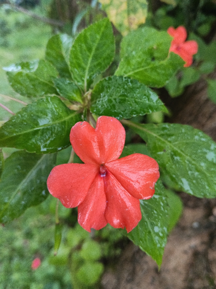 The scene depicts a close-up, top-down view of a vibrant red-orange flower, likely an Impatiens or similar species, located in the city of Banteay Srei, Cambodia. The flower is centrally positioned and in sharp focus, displaying five prominent petals, one of which exhibits a distinct heart-like or split shape at its apex. A dark purplish-red stamen/pistil is visible at the flower's center. Numerous large, glossy, dark green leaves surround the main bloom, many covered with visible water droplets, suggesting recent rainfall or dew. In the blurred background, another out-of-focus red flower is discernible to the upper right, and faint hints of green foliage and brown soil/bark are present. No people or human artifacts are visible.