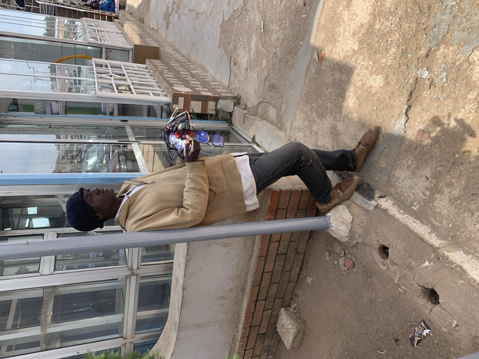 A male individual stands outdoors in Jos, Nigeria, leaning against a grey pole with his left side