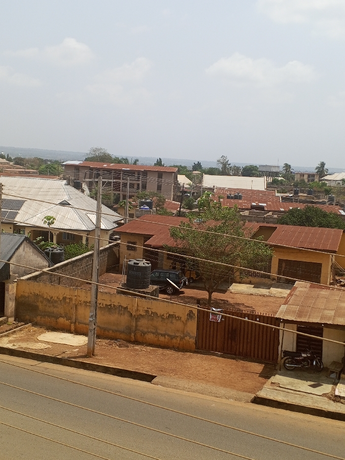 An elevated, static shot depicts a sprawling residential and commercial area in Oko Erin, Nigeria, under a hazy, pale blue sky with scattered clouds. The foreground features a two-lane asphalt road with a dirt shoulder. Multiple utility lines, possibly electrical, run horizontally across the lower third of the frame. A concrete utility pole stands on the left. Beyond the road, a low, faded yellow concrete perimeter wall with minor discoloration encloses a dirt compound. Inside this compound, a black cylindrical "STEMAX" brand water tank rests on a raised concrete platform. A dark-colored minivan is parked on the dirt behind the tank. A small tree with sparse green foliage grows to the right of the parked vehicle. A brown, vertically slatted metal gate with a partially visible white sign is located further right. Adjacent to the gate on the right is a small, single-story structure with a rust-colored corrugated metal roof, in front of which a motorcycle is parked on a dirt patch. The midground and background are dominated by numerous buildings, predominantly single to three-story structures with rust-colored corrugated metal roofs. Several smaller, blue or black plastic water tanks are visible on various rooftops. A notable multi-story building with a rust-colored roof is prominent in the upper-middle section of the image. Interspersed among the buildings are scattered green trees and vegetation. The distant horizon appears hazy, indicating a broad expanse of similar urban or suburban development extending into the background. No people or overt actions are discernible within the frame.