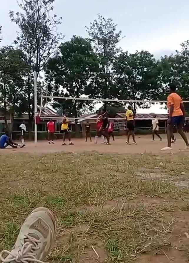 group of young people playing volleyball on a dirt court. There are trees in the background and a building. The camera is static and close to the ground, with a shoe visible in the foreground. The players are wearing various colors, including red, yellow, orange, and white. They are actively engaged in the game, moving and jumping to hit the ball. The sky is overcast.