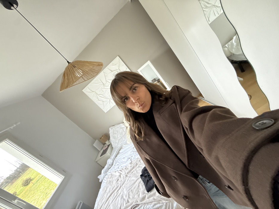 A young female adult is depicted in a selfie taken indoors, within a residence located in Veauchette, France. She possesses long brown hair with bangs and is wearing a dark brown double-breasted coat over a black turtleneck and light blue jeans. Her lips are pursed, and she gazes directly into the camera. The background reveals an unmade bed with light-colored bedding, upon which a black garment rests. A window on the left side of the frame offers a view of a bright green grassy field with a few distant trees under natural light. Adjacent to the bed is a white nightstand holding several objects. On the right, a white wardrobe or cabinet features a decorative wavy mirrored section. Two white, textured rectangular artworks are mounted on the wall above the wardrobe. A fan-shaped woven pendant light fixture hangs from the white ceiling. The walls are painted a light beige color.