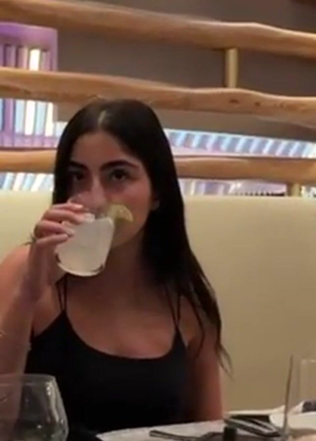 A young woman with long dark hair drinks from a glass in a restaurant. She is wearing a black top and a delicate necklace. She sits at a table with placemats, chopsticks, glassware, and what appears to be a beer bottle. A man's voice speaks in the background, but the speaker is not visible. The restaurant features a decorative wooden slat wall and upholstered booth seating. The overall lighting is soft and ambient.