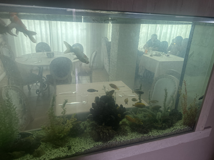 The image displays a large aquarium serving as a foreground element in a restaurant or dining area located in Kranevo, Bulgaria