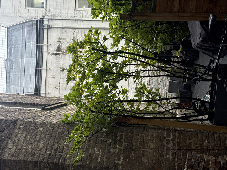 A narrow space between buildings, with a tall brick structure on the left and a white-painted building with windows and a metal structure on the upper left. Green tree branches with leaves partially obscure the buildings. On the right, an outdoor seating area with tables and chairs is partially visible, covered by a dark sheet. The overall impression is of an urban environment with vegetation encroaching on the built landscape.