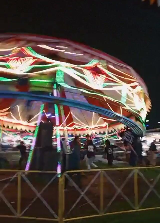 - "At night, a colorfully lit carousel spins rapidly in an open-air setting, possibly a carnival or fair" by FM-tZmSr1, licensed under CC BY 4.0
