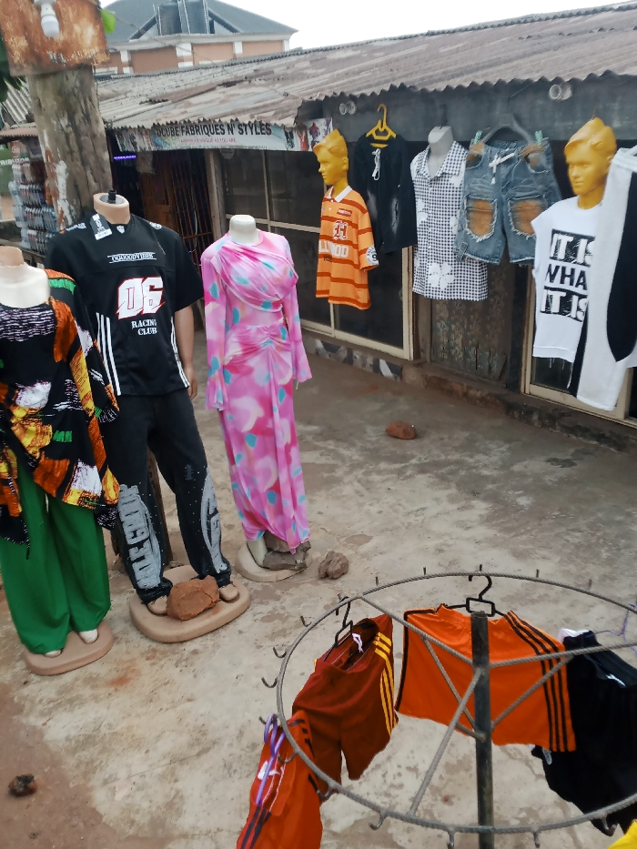 An outdoor clothing retail area is observed in Iju, Nigeria
