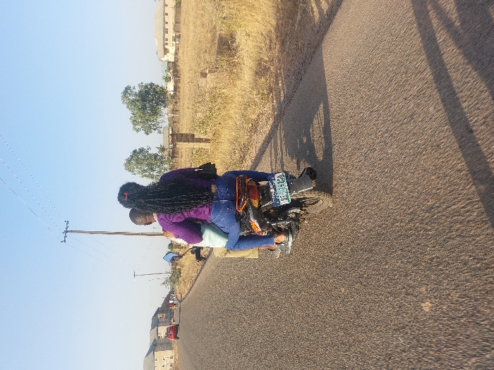 Two people ride a motorcycle down a paved road on a sunny day. The passenger has long, dark braids. A license plate is visible on the back of the motorcycle with the text "BE 045824". Tall grass and trees line the side of the road. Shadows from trees are cast on the road. Houses are visible in the background. Power lines are located near the road.