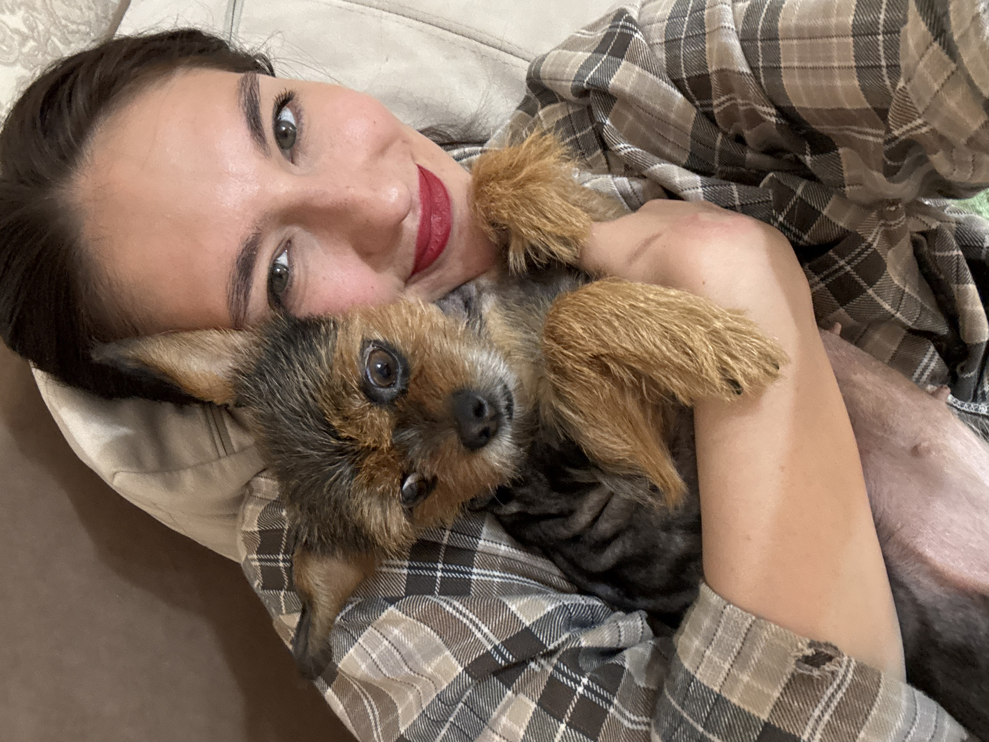 A woman with dark hair pulled back is lying down, embracing a small dog with brown and gray fur