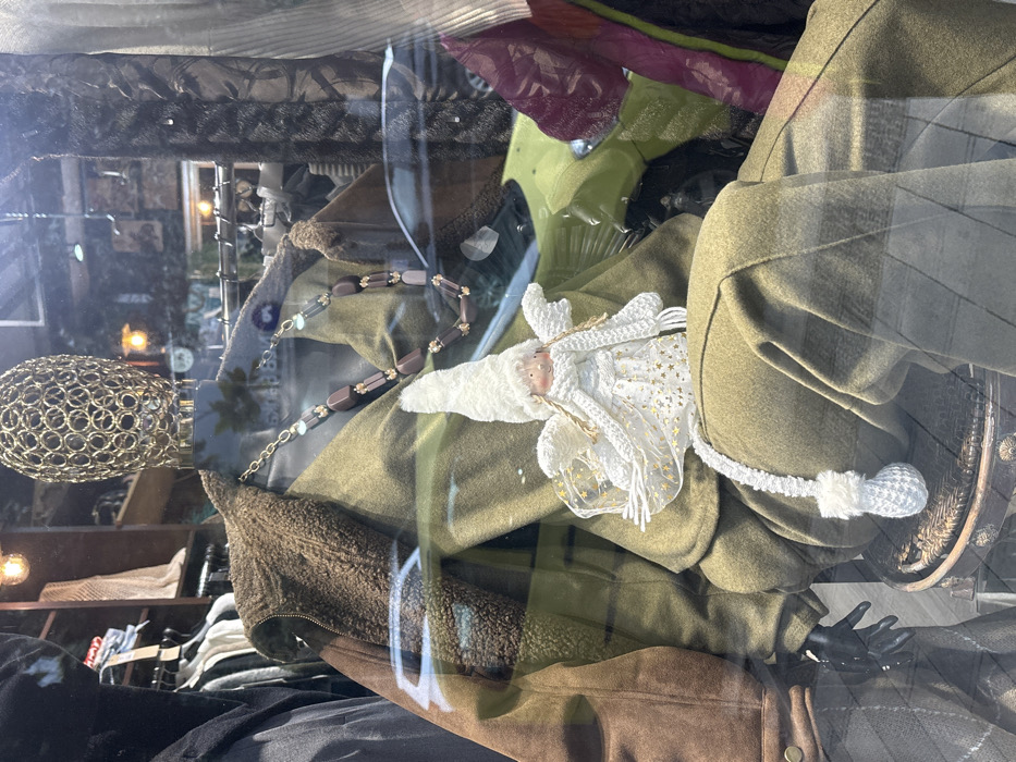 A store display window in Ulcinj - Ulqin, Montenegro, features a seated mannequin dressed in an olive-green suit, comprising a jacket or top and matching trousers. The mannequin wears a brown sherpa-lined vest over the suit and a long necklace with brown, grey-blue, and gold geometric beads. Its head is a gold-colored, open-weave metallic structure, and a black gloved hand is visible on its left side. Positioned on the mannequin's lap is a white, crocheted angel-like figure with a tall, pointed hat, blonde braids, a light-colored face, and sheer wings adorned with gold stars, holding a white crocheted item with a pom-pom. The mannequin is seated on a dark, ornate stool. The background inside the store, visible through the glass, shows clothing racks with various garments, fur-like textiles, and warm-toned exposed light bulbs. Reflections on the window glass include a prominent lime green or yellow-green vehicle on the right side, along with other indistinct architectural and light reflections from the street.