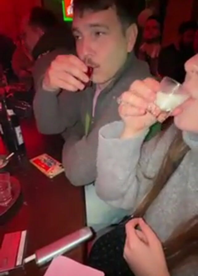 A couple, a man and a woman, are sitting at a bar, taking shots