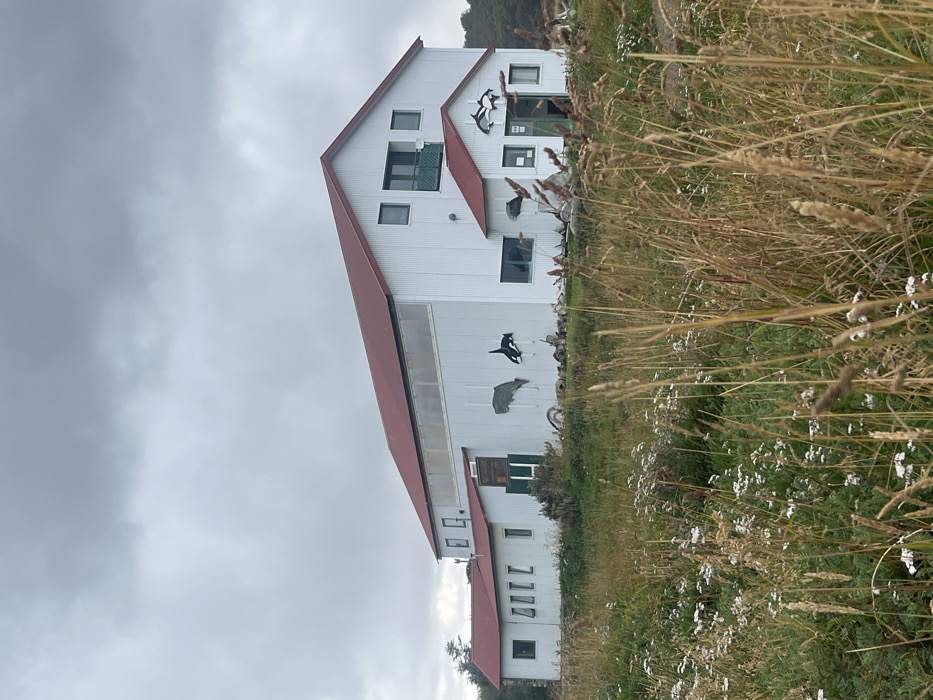 The image displays a large, two-story building with white corrugated metal siding and a red gable roof, situated in a grassy field under an overcast sky. The structure is located in Estancia Harberton, Argentina. The main section of the building features a prominent red gable roof and multiple dark-framed windows. The upper story on the right side has a central window with a small green balcony railing, flanked by two smaller square windows. Below this, a recessed entrance is sheltered by a small, red-roofed awning, featuring a green door and two small square windows. The longer side wall of the main building is adorned with two large, dark silhouettes of marine mammals: one resembling a whale and the other an orca. Below these silhouettes, various weathered objects, including what appear to be old tires and natural debris, are scattered on the ground. To the left, a single-story extension with a red roof adjoins the main building. This extension features a series of four small, uniformly spaced rectangular windows, followed by a larger window and an obscured dark green double door further to the left. The foreground consists of an untended field dominated by tall, dried, and green grasses, interspersed with numerous small white flowering plants. In the distant background, a line of dark green foliage, possibly trees or shrubs, is visible along the horizon. The sky is uniformly light gray and overcast. No individuals or active events are present in the scene.