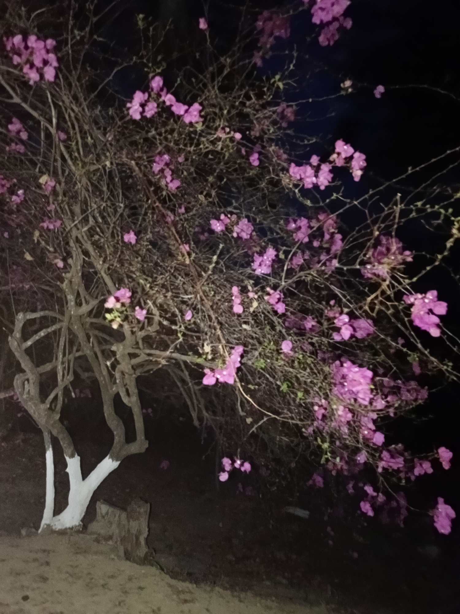 The image depicts a tree at night, likely in Los Leoncitos, Venezuela. The tree has thin, bare branches interspersed with clusters of bright pink flowers. The lower portion of the tree trunk is painted white. The surrounding environment is dark and appears to be ground or soil. There is no visible evidence of people or interactions.